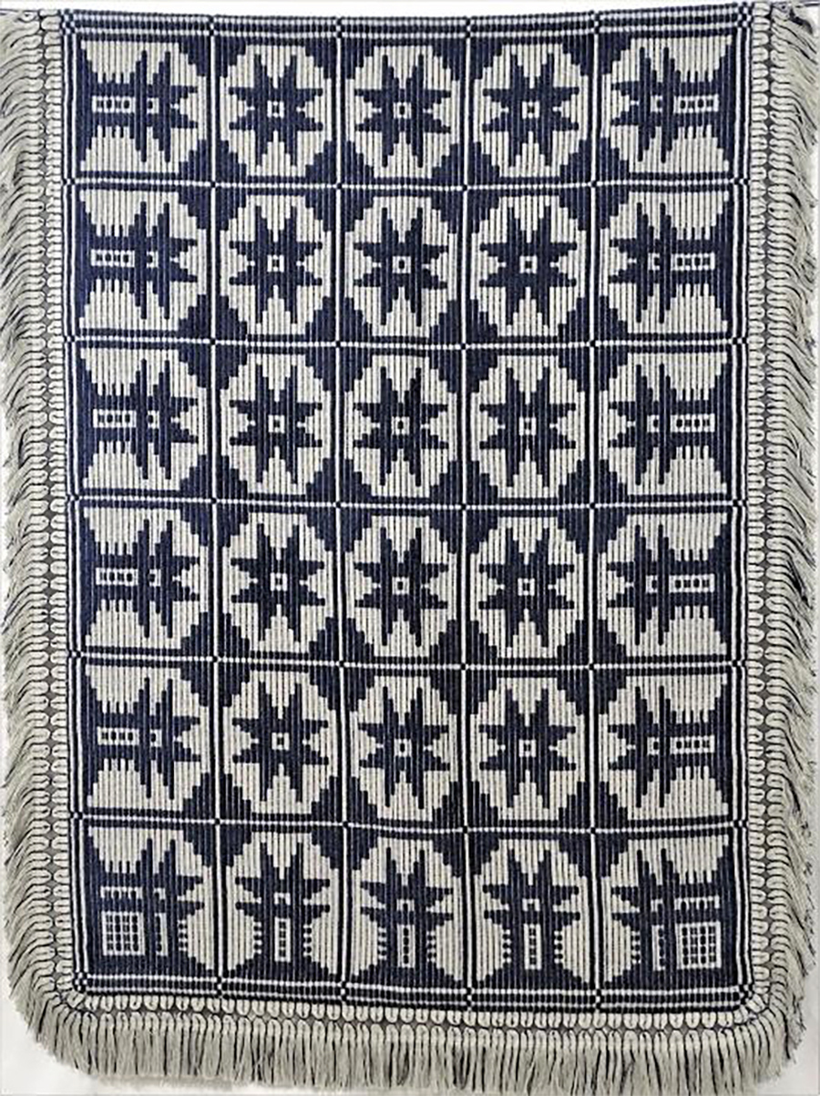 McGeary’s own weaving is based on this study of the original coverlets and related handwritten manuscripts. In the exhibit, she shares some of her original weavings alongside one of the original 19th century coverlets that she has interpreted into her own weavings, as well as photos of some handwritten German patterns and her digital transcription of the patterns.